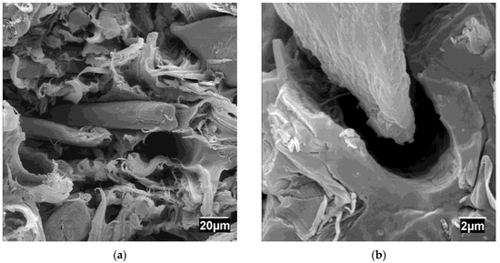 SEM micrographs of uncoupled PP composites reinforced with 40 wt % at different resolutions: (a) Detail of the dispersion of the ONPF fibers in the matrix and some possible pullout fibers; (b) Detail of a void in the fiber matrix interface.