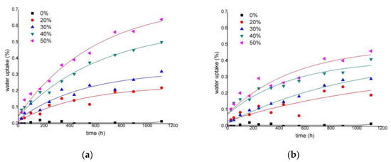 Coupled materials have a decreased water uptake (Figure 7b). The reasons are the same as those already discussed for materials exposed to humid conditions. In this case, coupled materials decreased their water uptake by 1%, 19%, 3% and 5% with respect to coupled ones at 20 to 50 wt % ONPF contents.