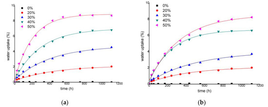 A second set of specimens of the same materials were totally immersed in water at 23 °C. Figure 7 shows its water uptake behavior.