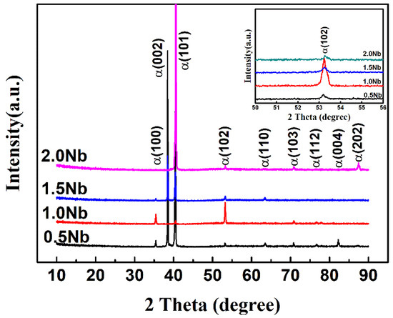 XRD spectra of the as-cast Ti-1100-xNb (x = 0.5, 1.0, 1.5, 2.0) alloys are shown in Figure 1. It can be observed that all the peaks are well matched with the α-Ti phase regardless of Nb content. Nb is a β-Ti stabilizing element, however no β phase is detected due to the sensitivity of XRD, and the alloy is still classified as near α titanium alloy. It also can be seen that the XRD peaks move to a low angle direction and then shift toward high angle orientations with the increase of Nb content. According to Bragg’s equation, the shift in peaks will cause an increase or decrease in the α-Ti phase lattice parameter. The effect of Nb content on the α-Ti lattice constant of the as-cast Ti-1100-xNb alloys will be discussed in the later part.