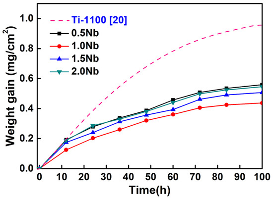 - Nb can significantly improve the high temperature oxidation resistance. The oxidation behaviors of the alloys follow a parabolic kinetic model. The parabolic oxidation rate decreased firstly and then increased with the increase of Nb content. The Ti-1100-1.0Nb alloy has the lowest kp value, which is 5.7 × 10−13.