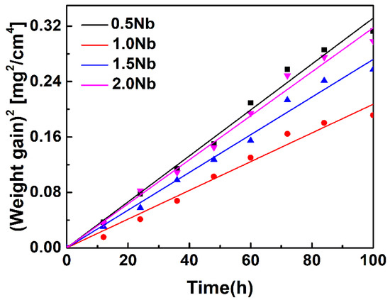 Figure 3 refers to the average weight gains per unit oxidation surface (ΔW/A) of Ti-1100-xNb (x = 0.5, 1.0, 1.5, 2.0) alloys and Nb-free Ti-1100 alloy [20] cyclic oxidized at 650 °C in an atmospheric environment for up to 100 h. The results indicate that all the average weight gains of the same composition alloy increase with the increase of oxidation time. The average weight gains of the alloys for 100 h oxidation decrease firstly and then increase with the increase of Nb content, and its value is 0.89, 0.56, 0.43, 0.51, and 0.55 mg/cm2, respectively. All the weight gains of Nb-added alloys are lower than that of Nb-free alloys, which shows that Nb can significantly improve the oxidation resistance. It also can be seen that the weight gain curves of the alloys follow a parabolic oxidation kinetic model, indicating that the oxidation process was controlled by diffusion [21]. The oxidation kinetics can be described by the Equation (1) [21,22]: