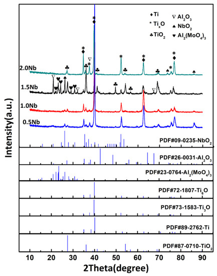 The massive solid solutions of O atoms in α-Ti can promote the formation of the low valence titanium oxide TixO (x = 3, 6) near the matrix surface, and the XRD analysis has proved the existence of Ti3O and Ti6O (Figure 5). Thermodynamic Equations (2)–(4) [25] at 650 °C showed that NbO2 was easy to form but with the lower stability, however the Al2O3 was more difficult to be formed in spite of the best stability. The lower Nb content and oxidation temperature caused the weak peak intensity of NbO2 and Al2O3.