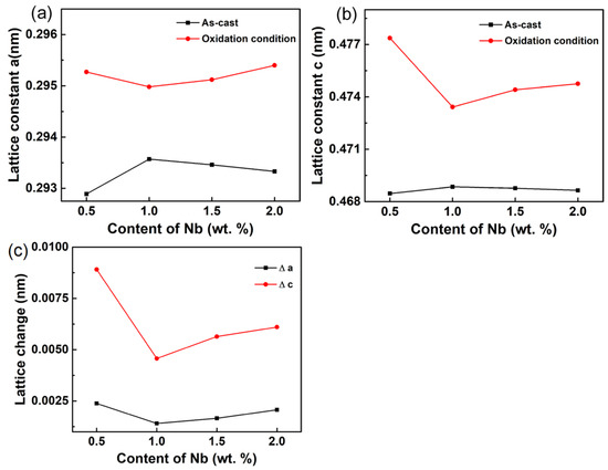 Effect of Nb content on the α-Ti lattice constant (a) a; (b) c and (c) lattice change of the as-cast Ti-1100-xNb alloys before and after oxidized at 650 °C for 100 h.