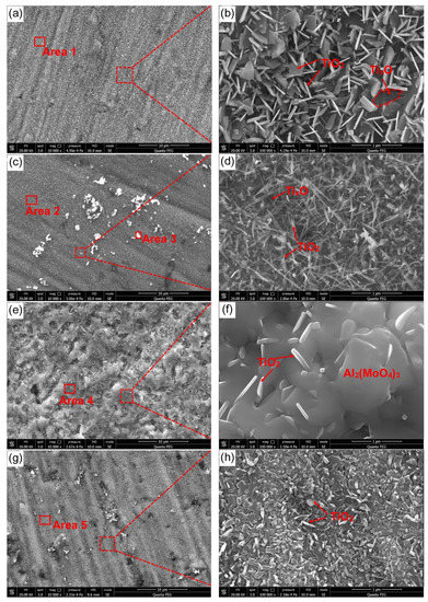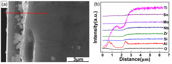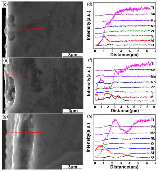 When the Nb content increases to 1.5 wt.%, there were the enriched layers of Mo, Nb and Al atoms near the oxide-surface, and its thickness reaches to 1.2 µm, as seen in Figure 8f. It can be identified as Al2(MoO4)3 layer according to the previous analysis. Some micropores in the Al2(MoO4)3 oxide-layer revealed its bad binding properties with the subsurface microstructure, which can lead to the peel off of the oxide-layer. It can also be found that Zr, Si have a slight fluctuation in Figure 8f,h. The enrichment Zr, Si and α-Ti in the interface may produce other compounds, such as (TiZr)6Si3 type silicide with the increase of Nb content [7], which caused the TiO2 oxide-film to crack and peel.