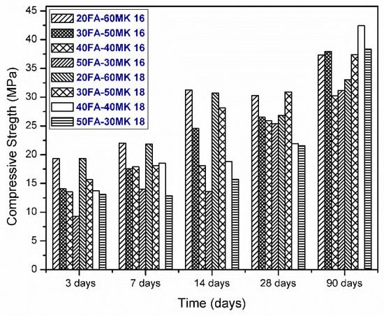 The best mechanical strength results were obtained at early ages in the systems with higher MK content; this assures that the amount of activator used is enough to activate MK at early age. It can be observed that the systems have a much slower increase in strength in initial stages (3–14 days), which is a characteristic of the replaced cements according to Barnett et. al. [27]. It has been reported that pozzolanic particles act as nucleation sites promoting the formation of C–S–H gel, as well as the densification of the cementitious matrix and reduction of porosity, besides improving fluidity through the effect of FA, which limits porosity [28,29]. The systems activated with 18% of Na2O that present greater strengths are the systems with a greater content of FA, this is confirmed by past investigations, where they indicated that a high alkaline media is required to obtain higher mechanical strengths [12]. All systems of 16% and 18% activator, synthesized and tested at 28 days, exceeds 20 MPa (the minimum compressive strength requirement of an OPC 20R), however, mixtures with 20FA-60MK reached strengths greater than 30 MPa when 16% Na2O was used and, when 18% Na2O was used, the system with compressive strength higher than 30 MPa was the 30FA-50MK system.