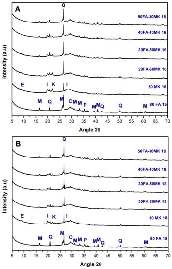Figure 2 shows the X-ray diffraction patterns of all systems with 16% and 18% Na2O of activation, cured at 90 days. In the figure is possible to observe an amorphous halo between 20 and 40° 2θ, which is associated with the amorphous fraction of the FA and MK. It can also be observed that the main crystalline phases of CK, such as alite and belite, are not observed in the diffraction patterns; with this, it can be confirmed that these phases reacted during the hydration process of all the systems. In the diffraction patterns from Figure 2, it is possible to observe that when the presence of FA increases, the reflection of the crystalline phases from the FA are still present in the systems, as mullite and quartz. This could be attributed to the fact that with the alkaline activation the crystalline phases remain unchanged, and only the amorphous phase of the original fly ash is affected [30].