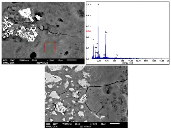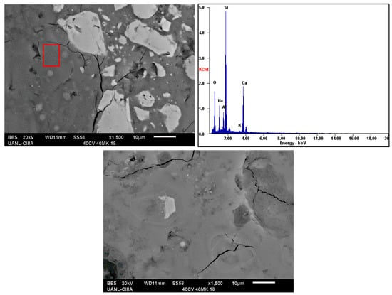 The EDS results showed in both of the figures indicated that the matrix was mostly composed of elements, such as Si, Ca, Al, Na, which is indicative that the matrix is constituted of two types of gels already reported: (a) one rich in calcium, silicon, and aluminum identified as C–A–S–H. This gel could be similar to that identified in the hydration of an OPC, but with Al in its composition, and (b) a gel composed of sodium, silicon, and aluminum, known as N–A–S–H [1,49].