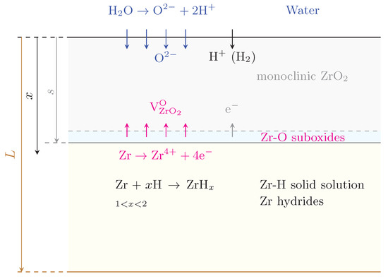 In view of this picture, and to be consistent with our recent work on oxide layer growth modeling [69], we split our model into two connected elements: (i) a transport part involving H diffusion through an evolving oxide layer, and (ii) a kinetic model of hydride formation and growth in the metal with a dynamic boundary condition set by the first part (i). Figure 2 shows a schematic diagram of the geometry considered for this study and the principal chemical processes taking place in the material. Although it is well known that the Zr oxide layer is not monolithic, containing various Zr-O phases depending on the external conditions and alloy composition [69,70,71,72], here we consider a single phase (monoclinic) ZrO with thickness defined by the variable . Hydrogen’s diffusion through this layer is thought to occur mostly along grain boundaries, in microstructures ranging from columnar in out-of-pile [71] tests to roughly equiaxed for in-pile conditions [70]. This phenomenon takes place during the pre-transition regime, before the oxide layer cracks and/or develops porosity due to Pilling-Bedworth stresses developed during the metal-to-oxide transformation [73,74]. Once cracking occurs, new diffusion avenues open up for hydrogen to reach the interface and diffusion is no longer seen as a rate limiting step. Our model applies only up to this transition point but not beyond.
