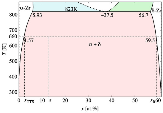 where is the terminal thermal solubility at the temperature of interest, and is the phase boundary. A phase diagram of the Zr-H system in the temperature and concentration region relevant to the present study is shown in Figure 4. By way of example, at 660 K (horizontal dashed line in the figure) is approximately at. and ≈ at.