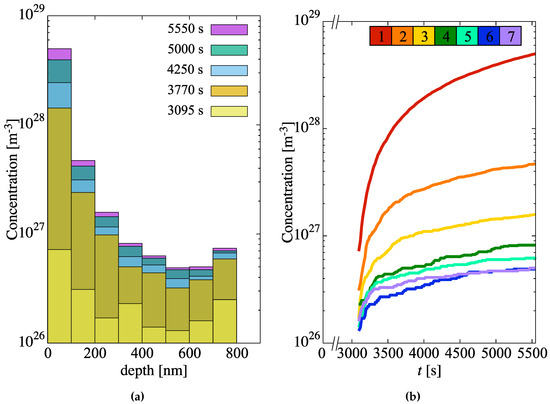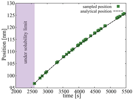 We begin with the time evolution of the hydrogen concentration at the oxide/metal interface. This results from solving the diffusion equation in the the oxide layer subjected to a moving boundary as explained in Section 2.2. Figure 5 shows the buildup of hydrogen up to the first 580 h. This represents a dynamic Dirichlet boundary condition for the spatially-resolved SCD calculations of hydride nucleation and growth in the metal substrate ( term in Equation (12)). Second, we track the sampling rate defined in Section 2.3.5 to confirm that it matches Equation (18). Figure 6 shows a comparison between both, indeed demonstrating their equivalency and confirming the correctness of its implementation in the code. The effect of this interface motion is that, over the course of the time scale covered in the SCD simulations, the oxide layer effectively sweeps over the first mesh element of the metal depth profile (recall that we assume that such sweep results in dissolution of the hydrides existing within that element at that point, and re-solution of the immobilized hydrogen in the metal). In practice, this allows us to subsequently discard the first spatial element of the 1D mesh. That is the reason why in the figures shown next the spatial range shown spans 800 (as opposed to the original 900) nm.