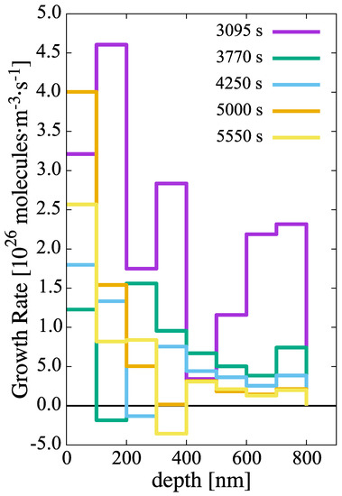 where Greek superindices refer to neighboring elements, i is the cluster species, and l is the element size. When summed over all neighboring elements, this term then represents the rate of migration of species i from volume element to , which can be now added to the r.h.s. of Equation (7) and sampled stochastically as any other event using the residence-time algorithm.