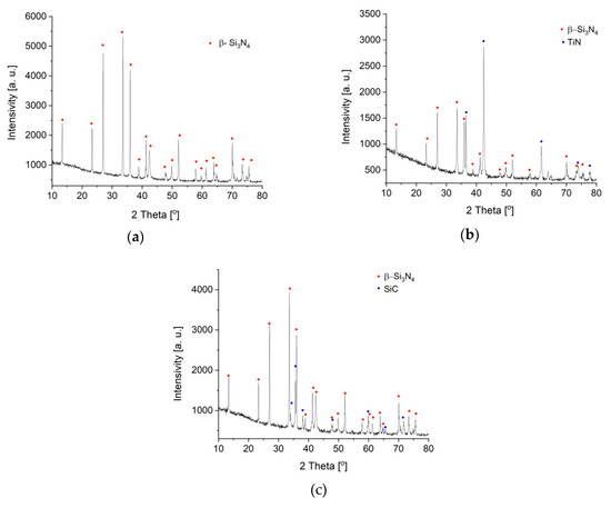 The prepared materials had high densities (Table 4). XRD analysis confirmed the presence of the assumed phases in the materials: β-Si3N4 in polycrystalline silicon nitride, and β-Si3N4 and silicon carbide or titanium nitride in the composites (Figure 2a–c). Sintering additives formed the amorphous phase, which was not visible in XRD patterns.