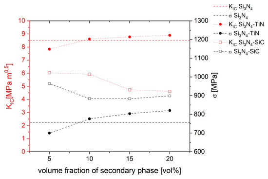 Silicon nitride-based composites are widely used structural materials. Their commercial usage is due to their great mechanical properties (high stiffness, strength, and toughness), high thermal and chemical resistance, and outstanding shock resistance [1,2]. The two most commonly used secondary phases in silicon nitride-based composites are titanium nitride and silicon carbide. Both are reported to influence the mechanical properties of composites. In Si3N4–TiN composites, an increase in fracture toughness is usually observed, but the strength of the materials may decrease [3]. There are also some works [4,5] where an increase in the strength and fracture toughness is reported. In the case of Si3N4–SiC, increased strength was observed by adding nanoparticles [6,7]. Nanoparticles located in the grain boundary phase are also reported to increase the toughness of the materials by strengthening the weak amorphous phase [8].