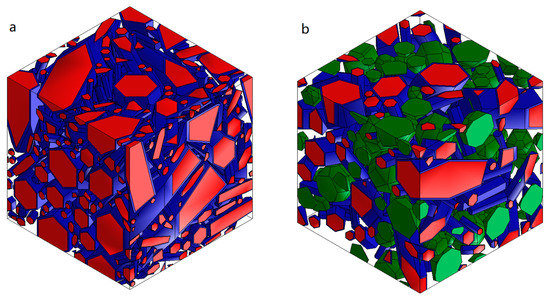 Models of composite materials (Figure 5b) contained an additional 20% of the secondary phase. This caused a decrease in the amount of elongated grains to 21% and, hence, a decrease in the amount of the grain boundary phase to 5%.