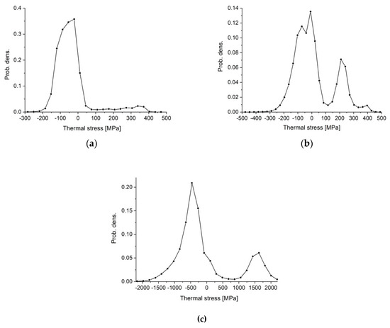 Histograms of residual stresses determined by FEM simulation for (a) Si3N4, (b) Si3N4 + SiC, and (c) Si3N4 + TiN.