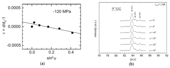 Measurements were made for polycrystalline silicon nitride and composites with 20% titanium nitride or silicon carbide with 6 wt % aluminum oxide and 4 wt % yttrium oxide. The results for Si3N4 and the secondary phases in the analyzed composites are presented in Table 6. The applied methodology enabled measurement of macrostresses for the depth of penetration of the surface layer in the range of −70 μm in the case of symmetrical Bragg–Brentano diffraction and 35–45 μm for the applied sin2ψ method.