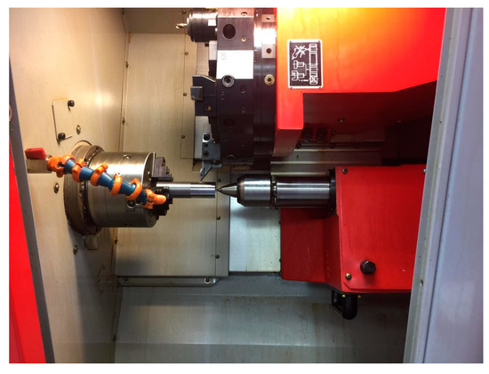 The CNC Turning machine, Emco Concept Turn 45 (Austria), fitted with Sinumeric 840-D digital system (Siemens, Waltershausen, Germany) was used for machining. All machining tests were conducted through a CNC part program. The codes for the used tool holders and inserts (Sandvik, Sweden) are SVJCL2020K16 and VBMT160404-VBMT331-PM, respectively. The specifications of the inserts were nose radius: 0.4; clearance angle: 7°; and cutting-edge angle: 75°. All experiments were conducted with cutting fluid conditions using a cooling pump (2.2 KW). The test rig for machining the workpieces is shown in Figure 1. In this paper, the CNC machine power consumption was determined by connecting the machine’s power lines with two measuring types: Tactix 403057 multi-meters (Meridian International Co. Ltd., Hecho, China). The first one was used to measure the voltage (V), and the second one for measuring the current (I). The power (P) was calculated according to Equation (1).