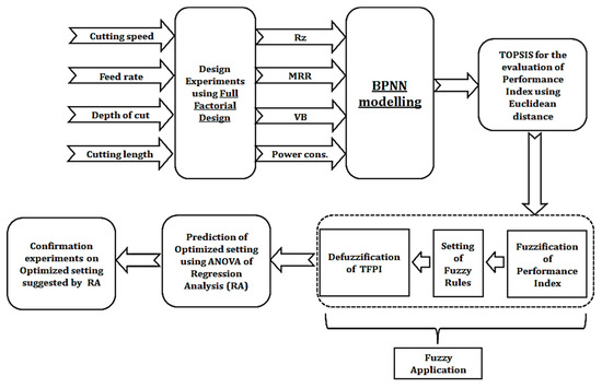 Optimization with TOPSIS-Fuzzy: The fuzzy approach is basically utilized for uncertain data and can provide a solution for real-time applications. These applications have numerous advantages as they are easy to understand, allow quantitative comparison, and are less complex [20,21]. The implementation steps of hybrid the TOPSIS-fuzzy technique for computation of CNC machining parameters for optimum responses are as follows: