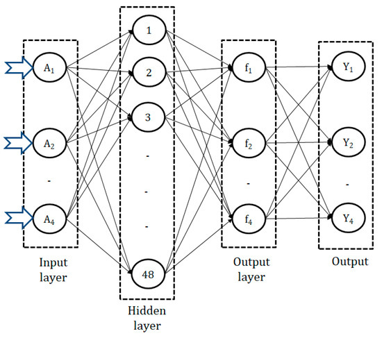 The main mechanism running behind backpropagation is the partial derivative ∂C/∂w. Here, “C” is the cost function, and “w” is any weight (or bias “b”) in the network. This partial derivative defines how quickly the cost of any function varies after a small variation in the weight (or bias). The significant advantage of BPNN is that each element has a spontaneous and natural interpretation if complexity exists. Therefore, BPNN not only provides a fast processing algorithm but also provides insights. The calculations in this take place as per Equations (4)–(6).