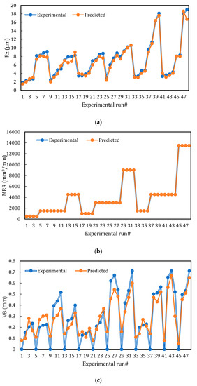 Figure 4 presents the correlation between the experimental values of Rz, MRR, VB, power consumption and the predicted values by BPNN. A close agreement between the experimental and predicted values was observed which proves the effectiveness of the BPNN modeling to establish the relationship between the studied machining parameters and responses and their further prediction with minimum error for ready industrial use.