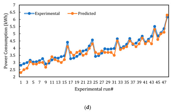 Predicted versus experimental runs: (a) Rz; (b) MRR; (c) VB; (d) power consumption (modeling step using BPNN).