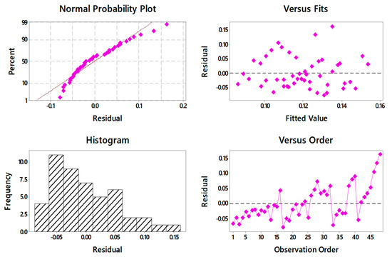 Figure 5 shows the residual plots for the developed empirical model. All the residuals were found on a straight line which reveals the normal distribution of residual and verifies the normality test. In the fit versus residual plot, all the residuals should be randomly distributed for an appropriate ANOVA. In the present research, this test was found to be a good fit with the experimental results. The best ANOVA is usually defined by the parabolic histogram which was observed in the present work. The fourth ANOVA test of time–variance was also satisfied in the current research. The larger the TFPI, the better the quality of the attribute; therefore, the highest level of process parameters suggests the better TFPI value. It was found that the third level of cutting speed (i.e., 300 m/min), the second level of depth of cut (i.e., 0.3 mm), the second level of feed rate (i.e., 0.15 mm/rev), and the second level of cutting length (i.e., 40 mm) provided the maximum TFPI. Therefore, the response characteristics corresponding to this setting provided the optimal solution which achieved the highest balance among all studied outputs.