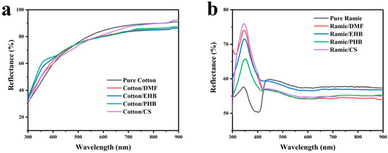 UV-Vis diffuse reflectance spectroscopy was proved to be good at investigating the optical property of including cotton fabric [23]. In this work, the optical properties of treated cotton and ramie were studied through UV-Vis diffuse reflectance absorption spectra (Figure 1). All of the cotton samples exhibited similar increasing reflectance as the wavelength increased from 300 to 740 nm. The reflectance remained at around 90% for pure cotton and cotton/CS, 85% for cotton/EHB, cotton/PHB and cotton/DMF in the wavelength above 740 nm (Figure 1a). In the wavelength below 400 nm (ultraviolet light), the reflectance of the treated samples was higher than that of pure cotton. In the wavelength above 480 nm, all the treated samples showed lower reflectance than pure cotton. The addition of mold inhibitor increased the reflectance of cotton for ultraviolet light, the greatest increment was at wavelength of 361 nm where the reflectance of pure cotton and cotton/PHB was 48.8% and 61.6%, respectively. While the reflectance for visible light decreased by about 5% after the treatment of mold inhibitor.
