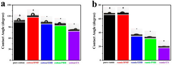 Wettability is interrelated to hygroscopicity, which is one of the most valued properties in wearing. Humidity as an important factor in warehouse is also influenced by wettability. The wettability of cotton and ramie fabric was investigated by contact angle (CA) measurement. Deionized water was dropped on the surface of the sample. Testing results of cotton samples (Figure 2a) were taken at 20 s after the water was dropped. It is observed that the contact angle of cotton/DMF (115.51°) was higher than that of pure cotton (102.72°). Contact angles of cotton/EHB (97.24°), cotton/PHB (92.24°) and cotton/CS (77.49°) were lower than that of pure cotton. The wettability of material is basically decided by its surface energy and the roughness of its surface [24]. Modifying the surface roughness of textiles is normally achieved by loading inorganic particles through various methods [25]. Raw cotton has a relatively rough surface compared to its fabrics. Mold inhibitor additives in this work are organic small molecules which have little influence on changing the surface roughness of the cotton. [26] However, the additives were all fine crystal powders which had higher surface energy than that of raw cotton. The increased wettability of the treated cotton samples was mainly caused by the additives changing the surface energy. Additionally, the difference among all the treated samples can be attributed to the different surface energy of these additives.