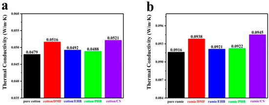 Thermal insulation and heat dissipation of clothes are directly related to the comfort for wearing. In addition, they are influenced by the thermal conductivity of the materials. Thermal conductivity of pure cotton and ramie and their mold inhibitor treated samples was measured by a TC3000E thermal conductivity tester (Figure 3). The thermal conductivity of pure cotton, cotton/DMF, cotton/EHB, cotton/PHB, and cotton/CS were 0.0479, 0.0516, 0.0492, 0.0488, and 0.0521 W/m·K (Figure 3a). As for the ramie fabric, the thermal conductivity of pure ramie, ramie/DMF, ramie/EHB, ramie/PHB, and ramie/CS were 0.0916, 0.0938, 0.0921, 0.0922, and 0.0945 W/m·K (Figure 3b). As observed in cotton and ramie fabric, the mold inhibitor treated samples exhibited an increment in thermal conductivity. This result can be attributed to the properties of the mold inhibitor. Both DMF and CS have a structure of vinyl group connected to the ester group forming conjugation effect which enhances heat transfer through electronic thermal conduction [27]. Additionally, the CS treated samples showed the highest thermal conductivity among all the treated samples, due to the 1, 4-butadienyl groups that also contribute to form a conjugation effect. The conjugation effect of paraben in EHB and PHB molecules was weaker than that of the two conjugation structures in DMF and CS, and the thermal conductivity increment of their treated samples was not so much as the other two samples. The increased thermal conductivity contributed to an improvement in heat dissipation and a decline in thermal insulation. A significant change of thermal conductivity for fabrics is usually achieved by large amount of loading thermally conductive additives with a good dispersion or even network structure [28,29]. However, none of the above conditions were met in this experiment, so it is plausible that the difference of thermal conductivities among all the samples was little. In general, the percentage of changed amount of thermal conductivity was less than 9%.