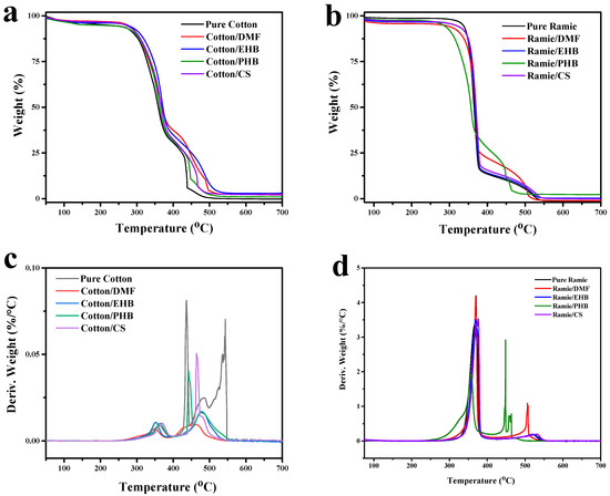 Thermal degradation curves of (a) cotton samples; (b) ramie samples. In addition, derivative weight of (c) cotton samples; (d) ramie samples.