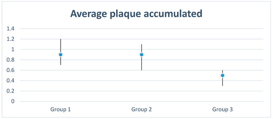 Average plaque accumulated at the end of monitoring on the healing abutments on each experimental group. Group 1: 0.9 (C.I. 0.7–1.2); Group 2: 0.9 (C.I. 0.6–1.1) and Group 3: 0.5 (C.I. 0.3–0.6).
