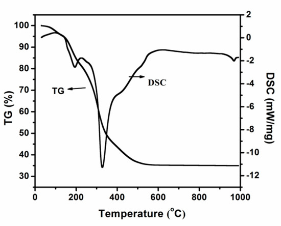Thermogravimetric-differential scanning calorimeter (TG-DSC) curves of the obtained precursor when tetrabutyl titanate and ethanol are used as titanium source and solvent.