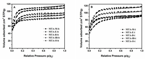 N2 adsorption–desorption isotherms of samples MTA-b (A) and MTA-i (B) calcined at 400 °C.