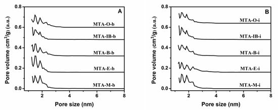 The corresponding pore size distribution curves of samples MTA-b (A) and MTA-i (B) calcined at 400 °C. For clarity, the pore size distributions curves of MTA-E-b/MTA-E-i, MTA-B-b/MTA-B-i, MTA-IB-b/MTA-IB-i, MTA-O-b/MTA-O-i are offset along the Y-axis by 0.16, 0.32, 0.48, and 0.64 cm3/g, respectively.
