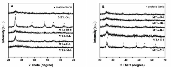 XRD patterns of samples MTA-b (A) and MTA-i (B) after calcination at 550 °C.