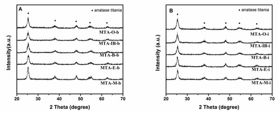 XRD results show that all samples calcined at 400 °C (not shown) are amorphous without the presence of any crystalline alumina and/or titania phases, suggesting that the extremely homogeneous super-microporous titania–alumina nanomaterials are formed. With the increase of quenching temperature, some samples begin to show crystallinity (as confirmed by wide angle powder XRD patterns shown in Figure 4) at the calcination temperature 550 °C. Several relatively weak diffraction peaks at 2θ = 25.3°, 38.5°, 48°, 55.1° and 62.6° are observed, which could be indexed as the anatase phase of titania. XRD results show that sample MTA-IB-b and MTA-M-i are crystalline, consisting only of anatase titania without any traces of crystalline alumina. When the solvent is ethanol, XRD patterns of the sample show quite broad and weak diffraction peaks, which suggests that the anatase titania crystal size is extremely small. However, the materials synthesized with other solvents are still amorphous. When the temperature is up to 750 °C (in Figure 5), all the samples are crystalline.