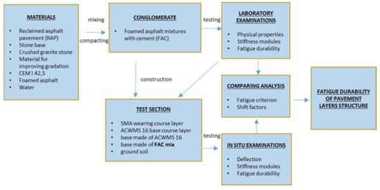 Asphalt layers (asphalt concrete and SMA) were laid on the base layer of the test section made of the FAC mixture. After making the pavement on the experimental section, deflection measurements were made, pavement layer modules were determined, and its fatigue durability was determined. As a result of research, an attempt was made to correlate the stiffness and fatigue life determined in the laboratory with the parameters of FAC mixtures of the test section. New fatigue criteria have been introduced for FAC mixtures used in the base layers. Laboratory tests of the stiffness modulus and fatigue life and developed fatigue criteria can be used to estimate the durability of future road pavement constructions, based on base layers of FAC mixes. The flow chart of the research approach is shown in Figure 1.