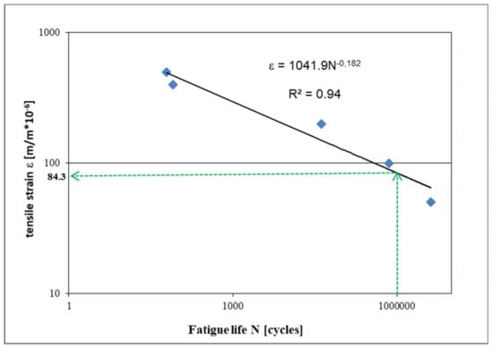 It was assumed that the number of load cycles Nf/50, to achieve a decrease in the complex stiffness modulus to 50% of the initial value, is equivalent to the destruction of the sample, then the test was also discontinued. The Nf/50 criterion applies to mineral-asphalt mixtures according to [38]. After the fatigue tests, data was obtained that allowed the estimation of the FAC mix fatigue curve—Figure 5. The fatigue curve is a relationship of fatigue life (on a logarithmic scale) as a function of the applied load value (strain). Fatigue life was determined as a mean value form six samples for each applied load strain.
