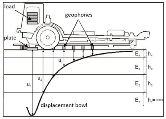 The results of deflection measurements were used to estimate the layer modules and the subgrade modules of the road pavement construction. The calculation model presented in Figure 13 was adopted for the identification calculations of the modules of the FAC layer. It is an elastic two-layer system, i.e., a layer arranged on the elastic half-space.