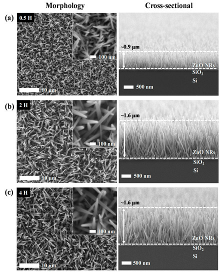 Field emission scanning electron microscopy (FESEM) images of the ZnO NRs after immersion time of (a) 0.5 h, (b) 2 h, and (c) 4 h with different magnification in between their morphological and cross-sectional images.