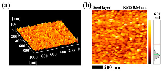 The morphologies of grown ZnO NRs are mainly attributed to the surface roughness of the seed layer. Figure 2 shows the AFM topographic images of the ZnO seed layer that provides nucleation sites for the growth of the ZnO NRs. The ZnO seed layer is uniformly distributed at the entire surface as shown in 3D AFM images (Figure 2a) with the roughness value of 0.84 nm (Figure 2b). This uniform distribution of nucleation sites contributed to the alignment and density of the grown ZnO NRs.