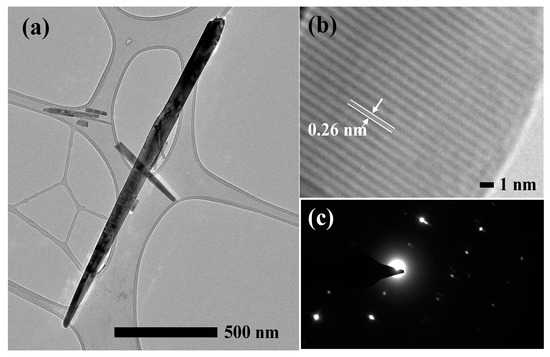 The crystal structure of ZnO NRs synthesized in 2 h was further characterized using a 120 kV TEM. The sharp nano-grass structure was observed as presented in Figure 4a. The length and diameter of the nanorod were measured to be approximately 1.6 µm and 40 nm, respectively, which is consistent with the FESEM results in terms of their morphologies and dimensionality. Meanwhile, the high magnification TEM image (Figure 4b) reveals the distance between two parallel fringes, which is approximately 0.26 nm, and it is fully consistent with the XRD result in terms of the d-spacing of the (002) planes of the wurtzite hexagonal of ZnO crystal. It confirms that the obtained ZnO NRs are crystalline with the wurtzite hexagonal structure, and are grown along the c-axis orientation, which is further affirmed by the selected area of electron diffraction (SAED) pattern, as shown in Figure 4c.