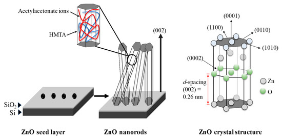 The growth of ZnO NRs is involved by the energetic and kinetic factor. After reaching the critical value, the ZnO starts to grow rapidly to form sharp nano-grass structures as can be seen in FESEM and TEM results. Acetylacetonate-derived precursor is soluble in HMTA, and both exhibit non-polar chelating agent properties [29,35,36,37]. They form stable multidentate ligand with the (101) non-polar facets of ZnO crystal, therefore, encouraging the growth in the single polar (001) facets. The velocity in the (0001) direction or c-axis is the fastest [38], hence ZnO NRs growth occurs mostly along the c-axis. The XRD and TEM results confirmed that the grown ZnO NRs have crystalline wurtzite structure along c-axis as the preferred orientation. From literatures, B. Ruqia et al. demonstrated that the growth of ZnO NRs along the (0001) direction by a direct solvothermal treatment was affected by controlling the concentration of the precursor and capping agents [28]. At lower concentrations of the precursor, they obtained an inhomogeneous low aspect ratio of nanorods, however, the aspect ratio of nanorods was increased with the use of octylamine as a capping agent. Meanwhile, Y. Chen et al. reported the high sputtering pressure was found to disturb the growth of the columnar structure of the ZnO deposited by radio frequency magnetron sputtering [39]. The illustration of the possible growth mechanism for the highly ordered ZnO NRs synthesized on the ZnO-coated SiO2/Si substrate using the acetylacetonate-assisted hydrothermal method are presented in Figure 5.