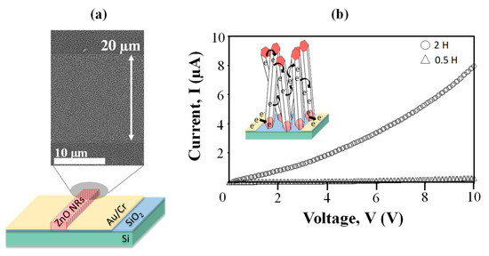 For electrical conductivity studies, the ZnO NRs were deposited on a fabricated channel with a distance of 20 µm, as showed in Figure 6a. The bending curve indicated a semiconducting behavior of the ZnO NRs, as can be seen from Figure 6b. As the voltage was swept from 0 to 10 V, 2 h sample shows higher current flow compared to 0.5 h sample. Higher density of ZnO NRs produced more interconnection between the nanorods, hence, induced more electron pathway, as illustrated in inset Figure 6b. The resistivity of the ZnO NRs can be calculated using this formula (7) [40], resistivity;