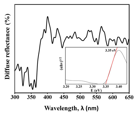 The room temperature UV-vis diffuse reflectance spectrum of ZnO NRs obtained after 2 h of immersion time is shown in Figure 7. The spectrum reveals a rapid change in the diffuse reflectance of the ZnO NRs at a wavelength of 370 nm which can be explained to the reflection of the intrinsic bandgap of ZnO due to the electron transitions from the valence band to the conduction band (O2p→Zn3d) [43]. Tauc’s plot was used to determine the optical bandgap energy of the ZnO NRs by drawing the tangent line at the lower energy sides. The Tauc’s plot of the diffuse reflectance of the ZnO NRs is presented in the inset of Figure 7, and it exhibits a bandgap of 3.35 eV. These electrical and optical properties of ZnO NRs prove its applicability in biosensor applications [13,44]. This is due to the fact that ZnO NRs could provide higher surface reaction activity for biomolecules immobilization, and their good electrical conductivity could enhance signal transductions during the detection, hence resulting in greater device performances.