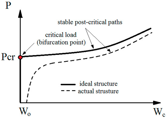 Regarding the axial compression of a structure, a typical thin-walled composite structure is characterized by the three main states of work [1,2,9]. The first state, known as pre-critical, is characterized by the structure’s walls only being compressed. The second, critical state, appears after reaching the bifurcation point, as a result of which a linear range of work is transferred to a non-linear one. Post-critical state is the one in which deformations result from bending increases. Post-critical state with great overloading leads to the loss of structural integrity—and thus, to damage. Figure 1 [2] presents a general view of the individual operating states of thin-walled structures, when the post-critical equilibrium path is in stable condition.