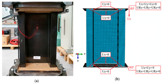 Regarding to the discrete model, the boundary conditions corresponding as closely as possible to the experimental research were prepared. In the numerical model, contact properties were applied (in normal and tangential directions, without friction coefficients) between the composite structure and non-deformable plate elements. The plates had defined reference points in which the boundary conditions were determined, which enabled the axial compression tests. Additionally, at the edges of the cross-section of the composite structure, appropriate degrees of freedom were taken away in order for the structure to work properly. Due to the initial implementation of the buckling analysis, a unit force was applied as a load in the numerical model. This approach made it possible to determine the values of critical load as part of the linear solution of the problem (linear perturbation, buckle). Further analysis in the overlapping state was carried out by solving the non-linear structural stability problem, where the unit load was replaced by compressive displacement, performed until the total failure—based on Newton-Raphson’s incremental-iteration method (static, general). Numerical calculations were carried out taking into account preliminary imperfections constituting 0.05 profile wall thickness, which corresponds to the first buckling mode. The boundary conditions of the numerical model and the position for experimental studies are presented in Figure 4.