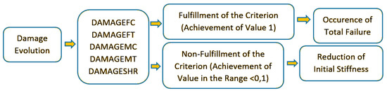 As mentioned earlier, the description of damage evolution for ABAQUS® is initially based on the damage initiation associated with fulfilment the Hashin’s criterion. The main principle of damage evolution assumes that the dissipation energy in the damage process is proportional to the volume of the damaged finite elements of numerical model. In FEM calculations, the damage evolution is strictly controlled by equivalent displacement; therefore, the calculation process itself is based on the constitutive compound “equivalent stress-equivalent displacement” [36]. As mentioned earlier, the progressive damage analysis includes five components, which in the context of numerical analysis are called tensile fiber damage—DAMAGEFT; compressive fiber damage—DAMAGEFC; tensile matrix damage—DAMAGEMT; compressive matrix damage—DAMAGEMC; and shear damage—DAMAGESHR. The algorithm of the progressive criterion is shown in Figure 6.