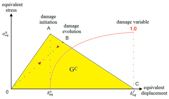 Referring to the Hashin’s criterion (damage initiation), the point of damage initiation defines a gradual reduction of stiffness of the material (reduction of mechanical properties of composite material) for a given variable of the damage initiation process. In FEM calculations, damage evolution was described by damage evolution law, which constitutes a generalization of the concept presented by Camanho and Davila [25]. With respect to composite materials, the damage evolution process can be described using exactly five independent damage variables, presented in the theoretical approach: compressive and tensile fiber damage, compressive and tensile matrix damage and shear damage. In the case in which the damage initiation is fulfilled, further loading of the structure causes damage evolution which is realized by fracture energy dissipated during the damage process.
